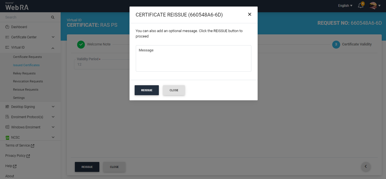 On the Certificate Reissue screen, you can add an optional message, then click Reissue.