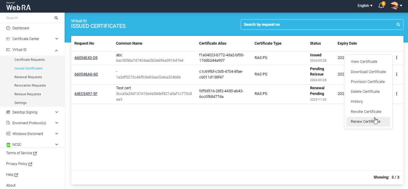 Click "More Actions" to revoke, rekey, reinstate or renew a certificate as per configured in the admin portal.
