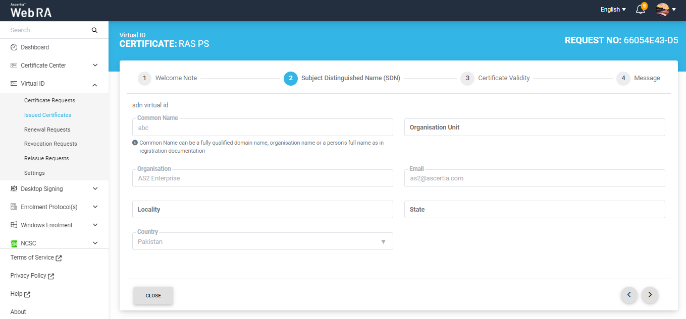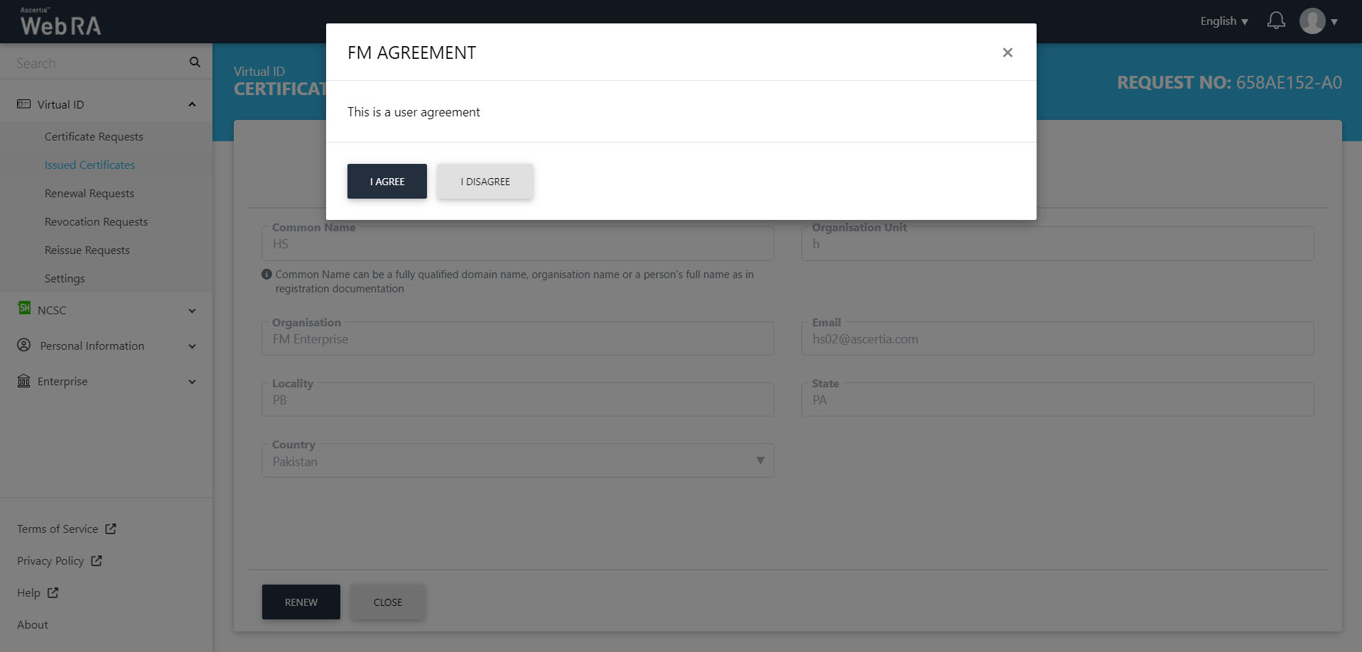 When a user registers ADSS Web RA Server with citizen ID, which is configured in the Configurations > Default Settings, he is redirected to the Virtual ID issued certificates listing. The Virtual ID and SigningHub accounts are created. Once complete, the Virtual ID certificate is created and provisioned in SigningHub.