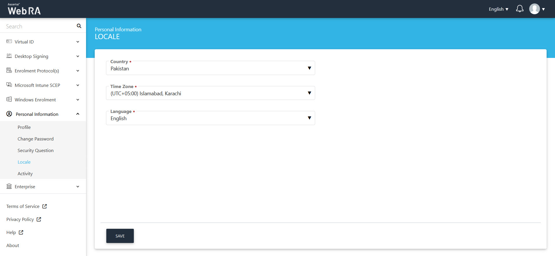 This section in the web portal is used to specify regional information, so that your account configurations can be customised according to your geographical location. Once specified, ADSS Web RA will start manipulating your all transactions according to your time zone, and will change the entire interface into your language.