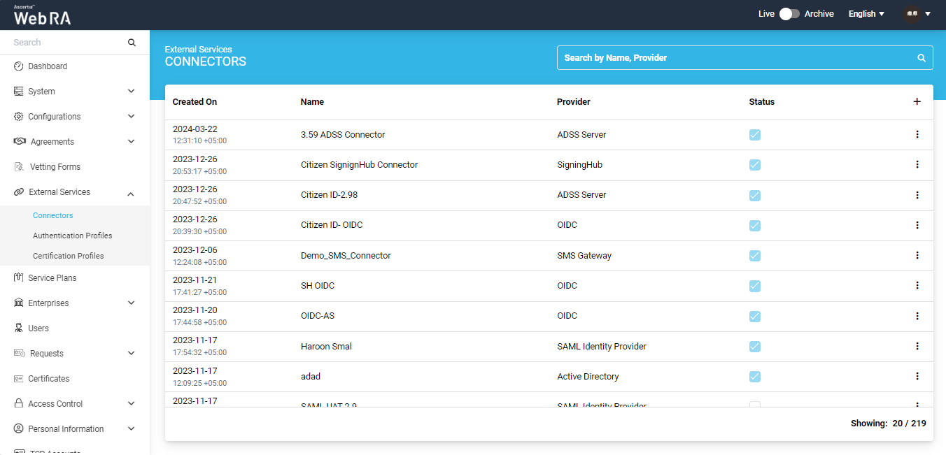 A set of configurations saved in ADSS Web RA Admin to communicate with a particular third party system (server) is called a connector. Connectors are created to use different types of third party services in ADSS Web RA i.e. Active Directory, ADSS Server, Google Captcha, etc.