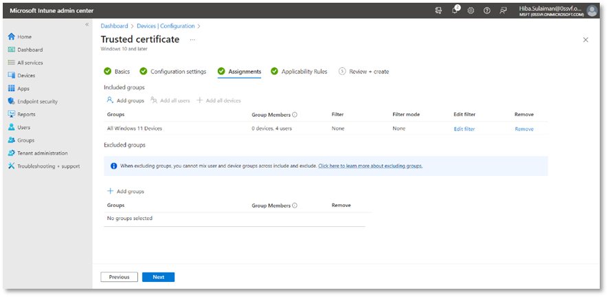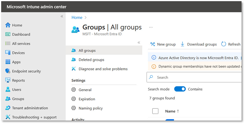 - In case you are unable to access Groups in the Microsoft Intune admin center, make sure that you are not connected to Ascertia’s network. Switch to a different network to access Groups.