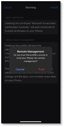 - When prompted, tap Trust to enrol your iOS device into remote management.