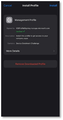 - The configured management profile will be enabled, tap Install to proceed.