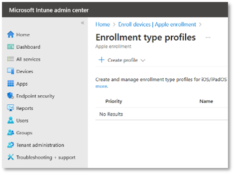 - From the Enrolment Options, click Enrolment Types. Then click Create profile. Select iOS/ iPadOS.