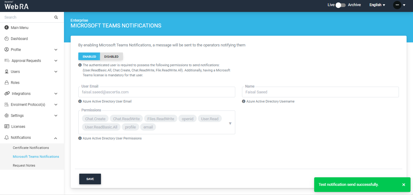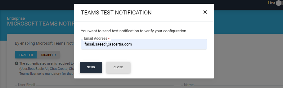 After enabling the setting, the system will display a ‘Teams Test Notification’ popup. Through this popup the operator can check if the configurations are working properly or not.