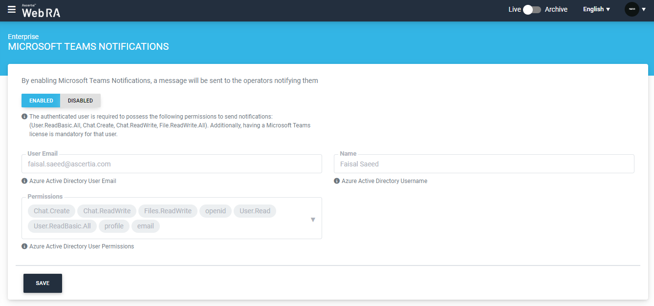 Once the ‘Microsoft Teams Notifications’ setting is enabled, the operator can view the following details of the user in disabled form: