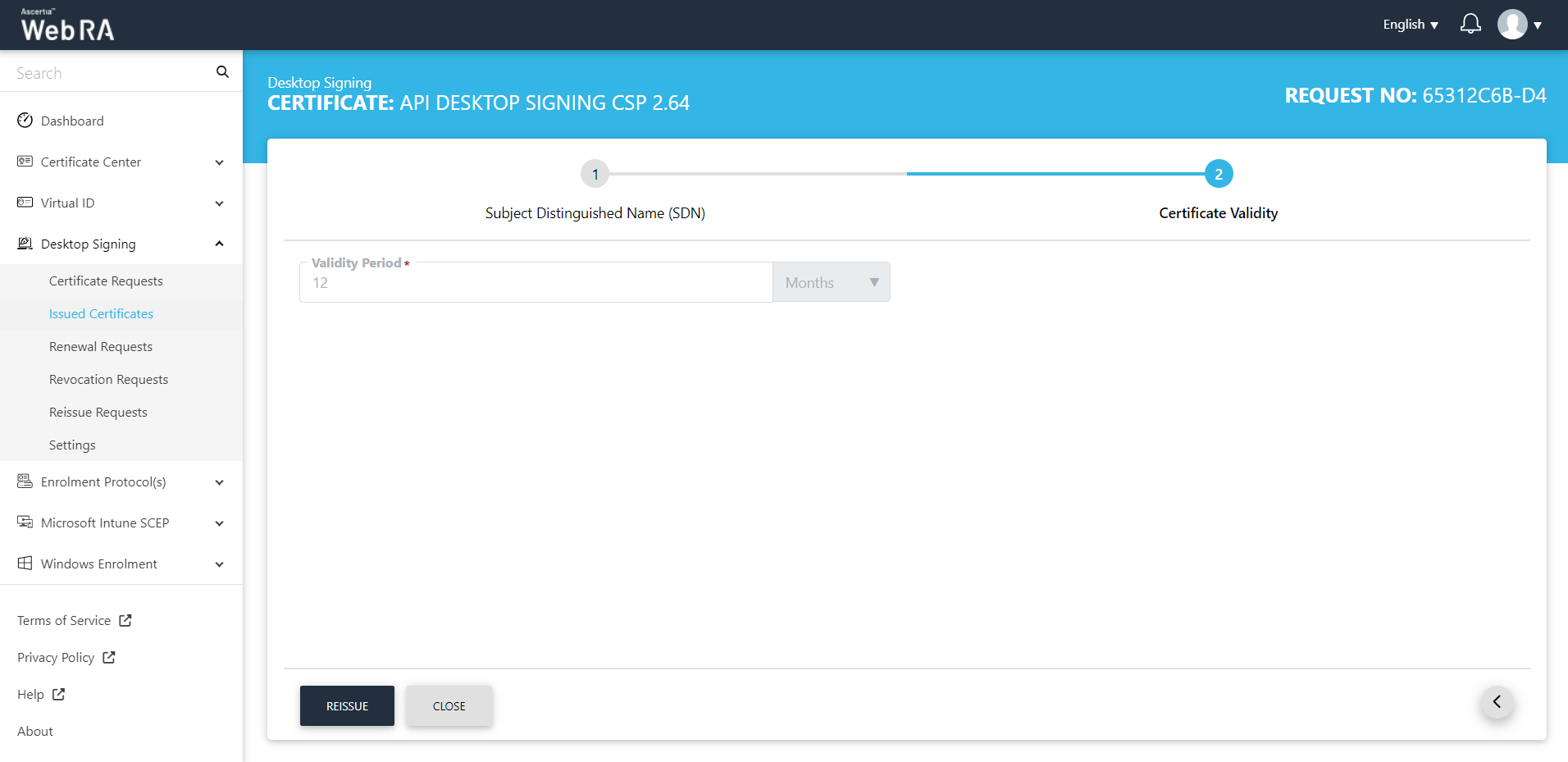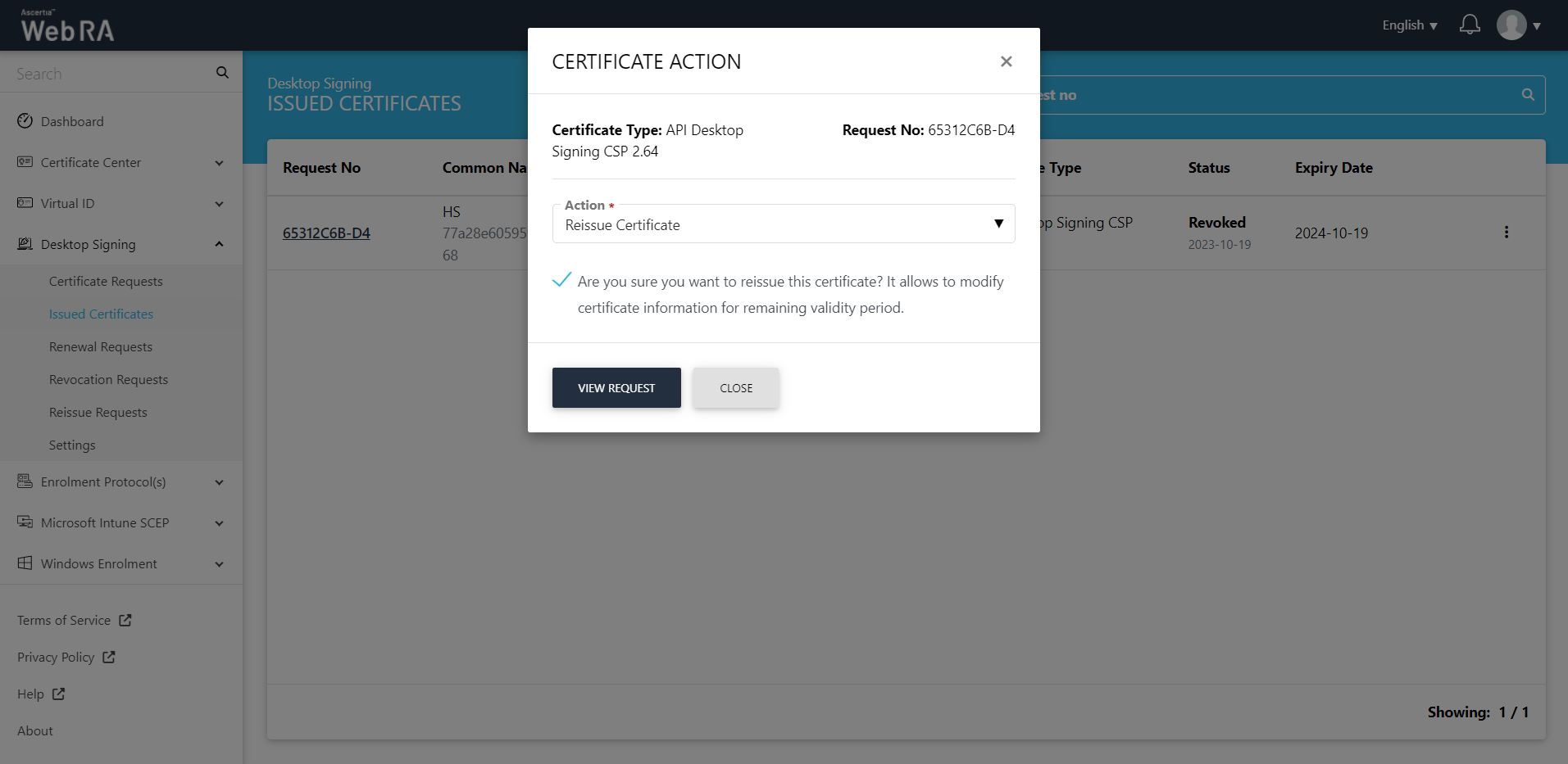 This section lists all the reissue certificate requests pertaining to the Desktop Signing user.