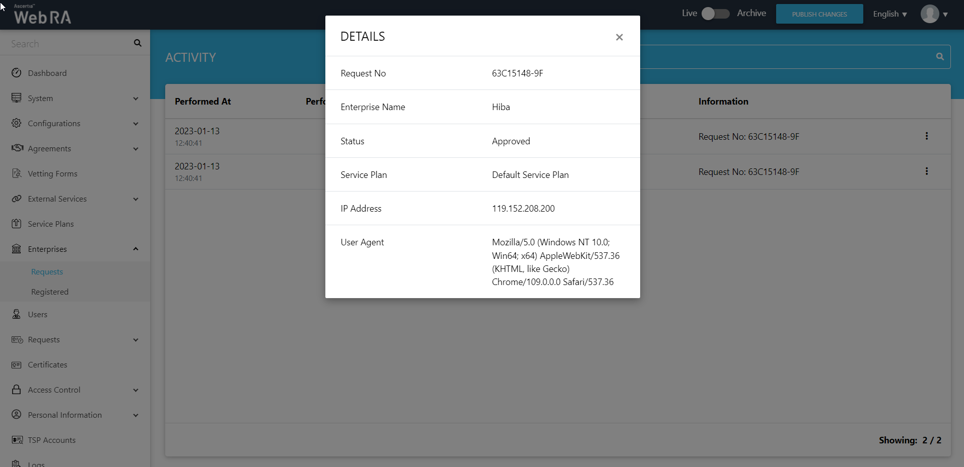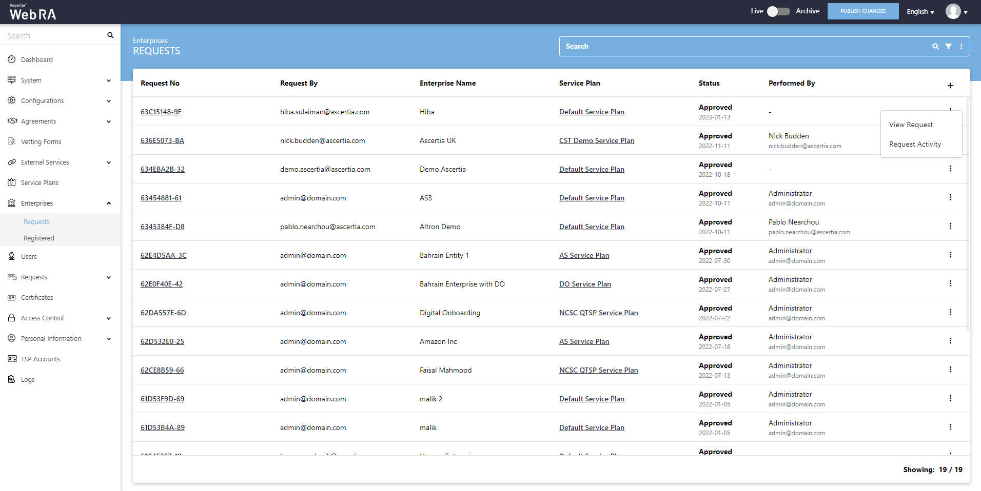 This section lists down all the enterprise requests that are created in ADSS Web RA application. This list contains all the pending or approved enterprise requests.