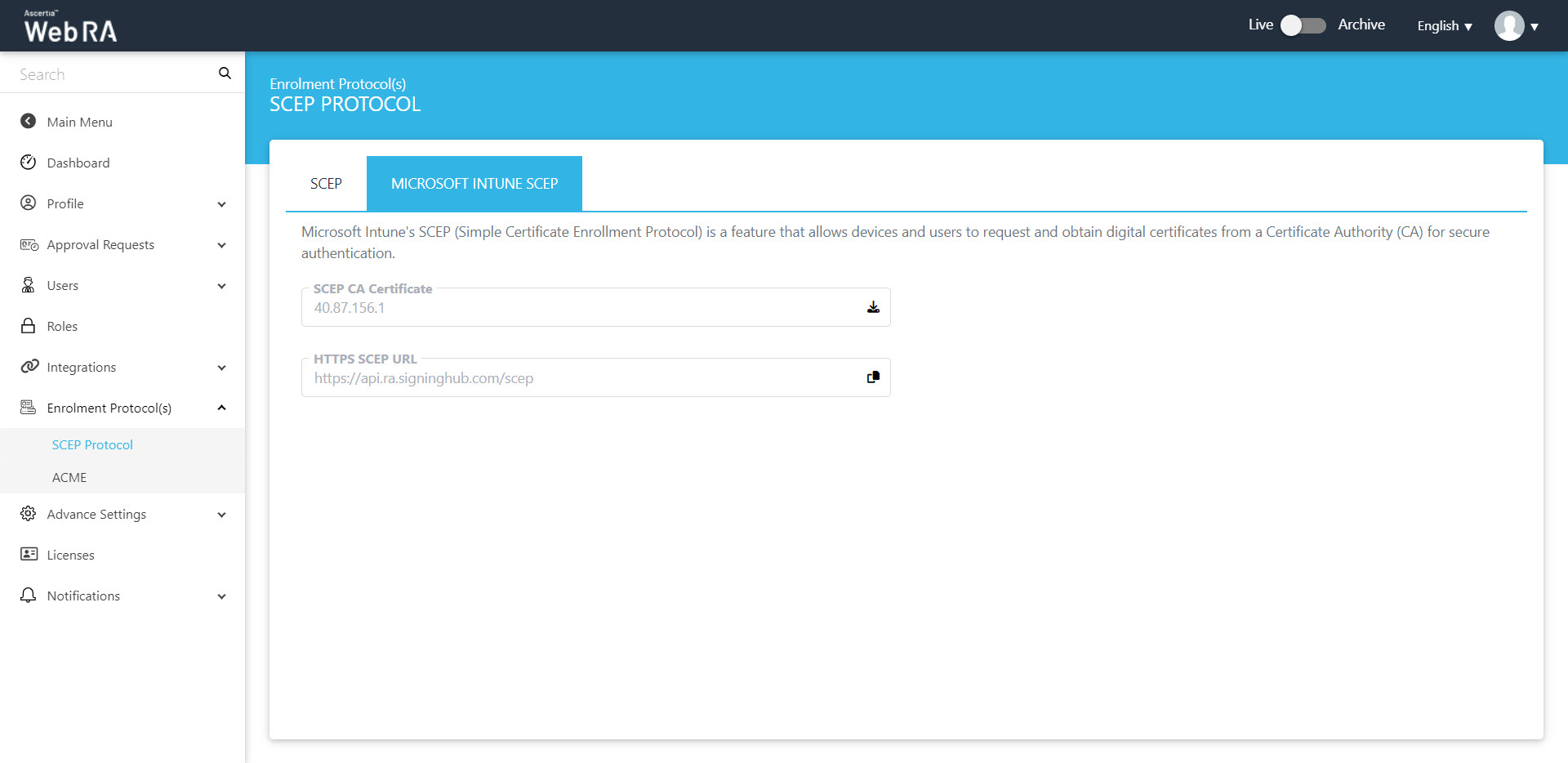 This URL is set in the configurations and is required when managing certificates using Microsoft Intune SCEP Certificate, e.g [Server URL]/scep. |