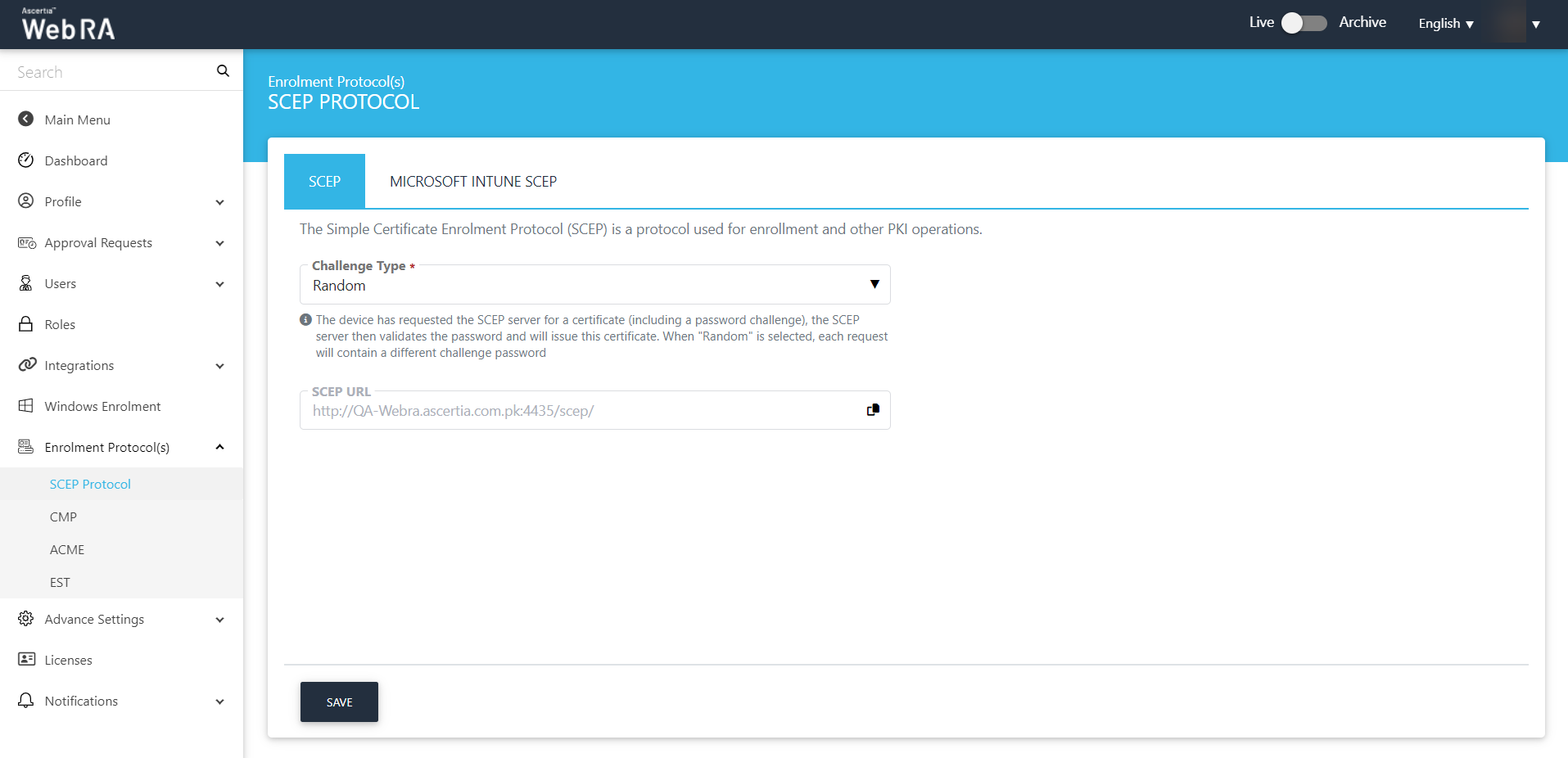 Once you select the challenge type, a URL will be generated. This URL is required when managing certificate using SCEP, e.g [Server URL]/scep. |