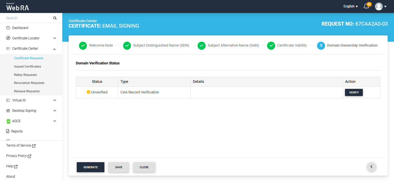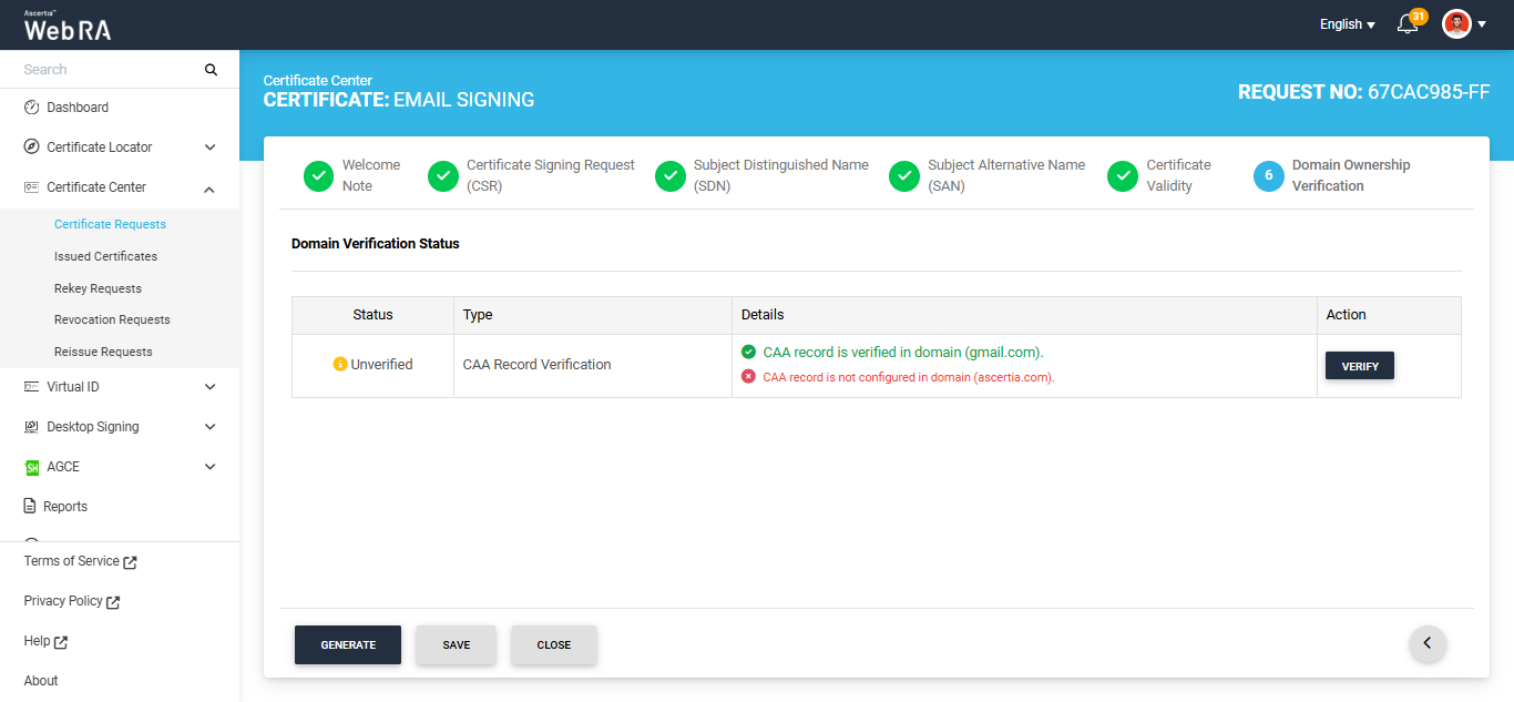 If you attempt to generate the certificate while the Domain Verification Status is ‘Unverified,’ the system will display an error dialog prompting you to verify your domain CAA records before proceeding.