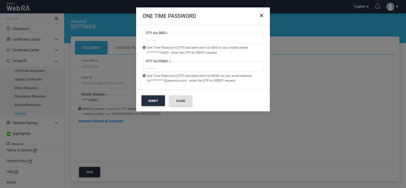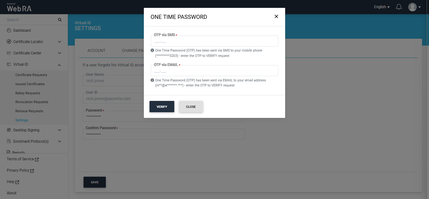 An OTP will also be sent to user's email address, enter it in the OTP via EMAIL box and click Verify to proceed.