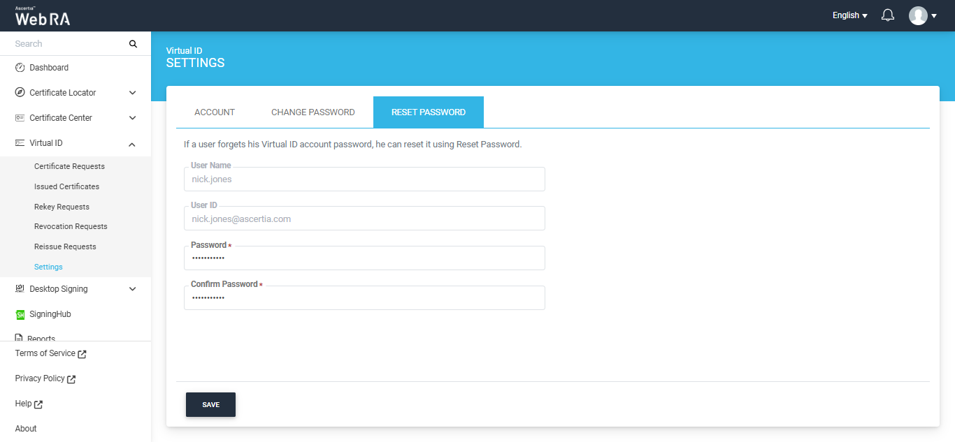 The system will not display the 'Change Password' and 'Reset Password' tabs in the settings page if the 'Enable Virtual ID Registration With Password' option is disabled in the RAS certification profile. |