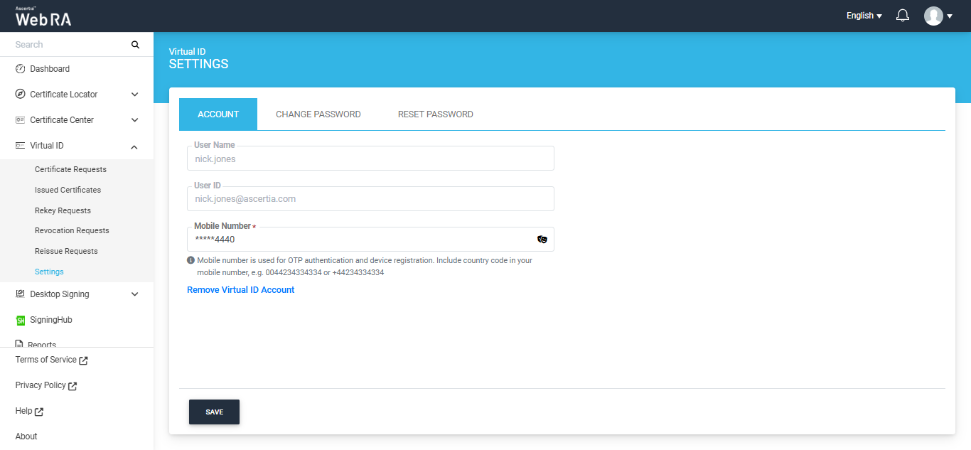 - A user will also have to change the configurations in the ADSS Server to change the Virtual ID mobile number.