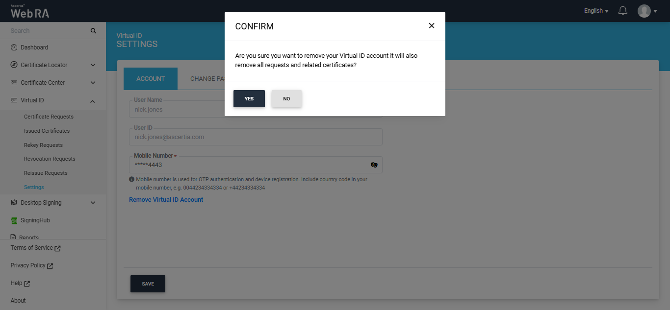 - A confirmation message will appear. Click "Yes" to remove your configured Virtual ID account.