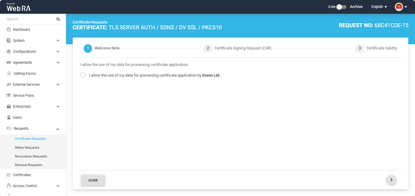 After uploading the CSR, the following screen will appear. You can also view the details of the CSR by clicking on the ‘Eye’ button.