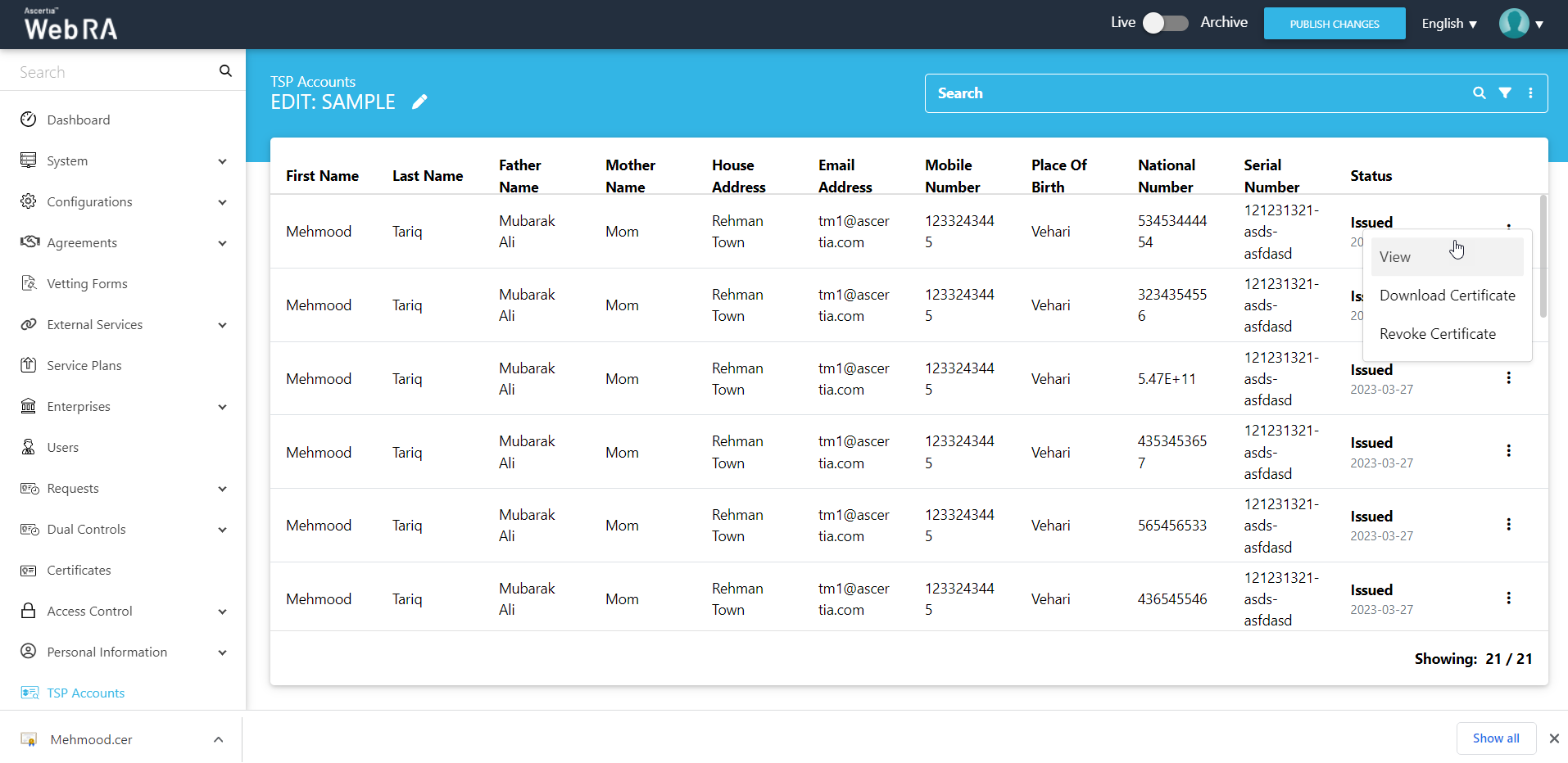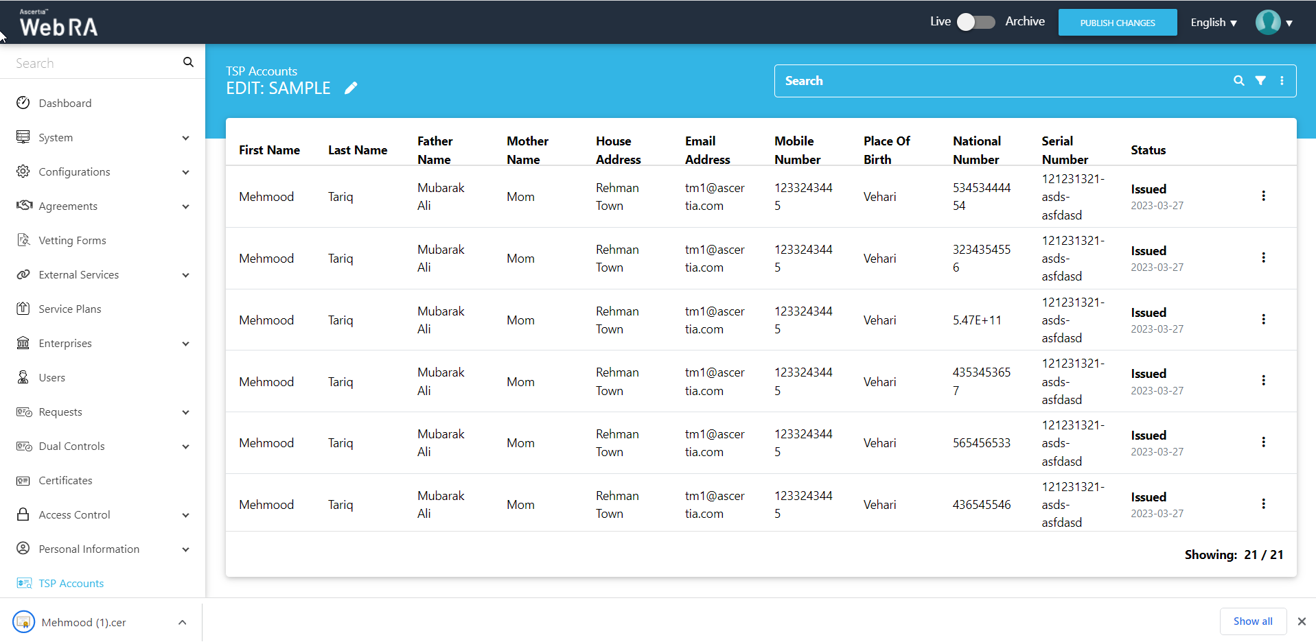 - The subscribers' data includes certificate serial number, full name, email address, phone number and the base-64 of the certificate.