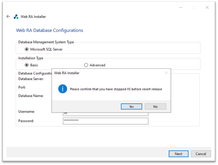 Click the Next button to continue to the database type screen. Select the database type - Microsoft SQL Server or PostgreSQL - that was used in your previous Web RA installation.