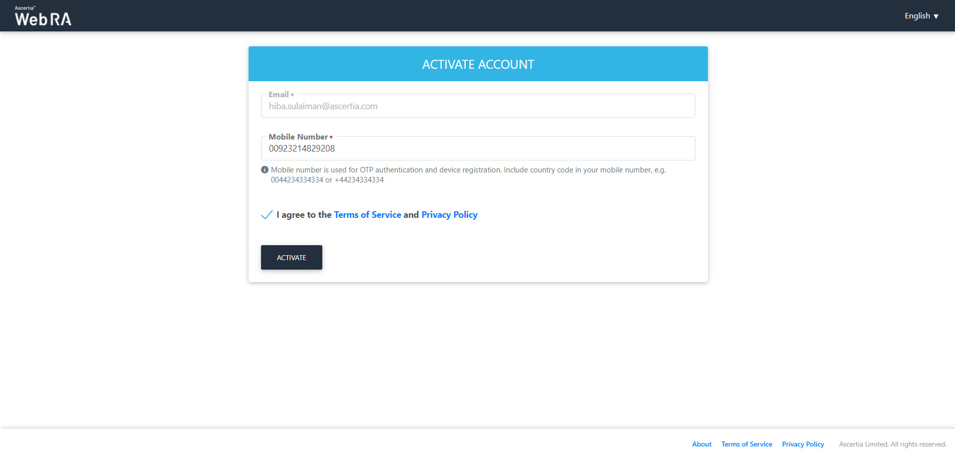 The account activation screen will appear. Enter mobile number and select I agree to the Terms of Service and Privacy Policy and click Activate.