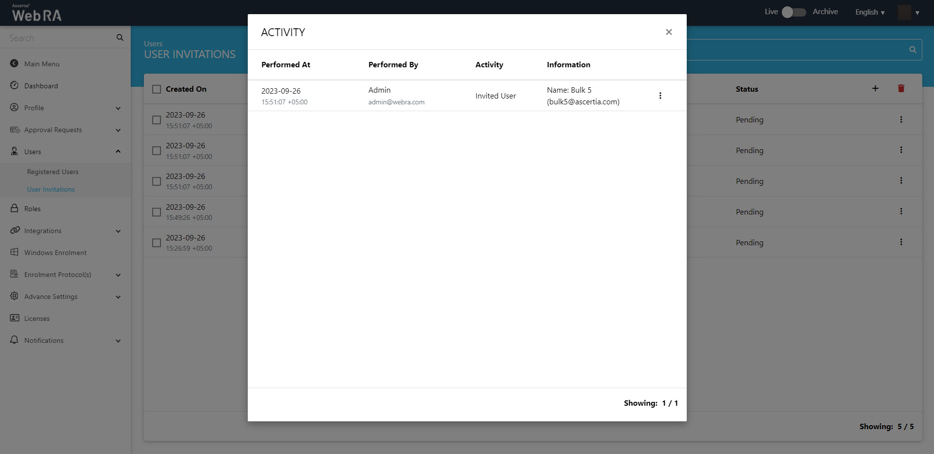 A user activity is also created for the user invitations and displayed on the screen as shown below: