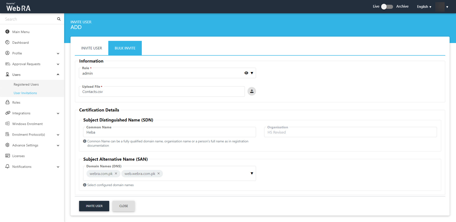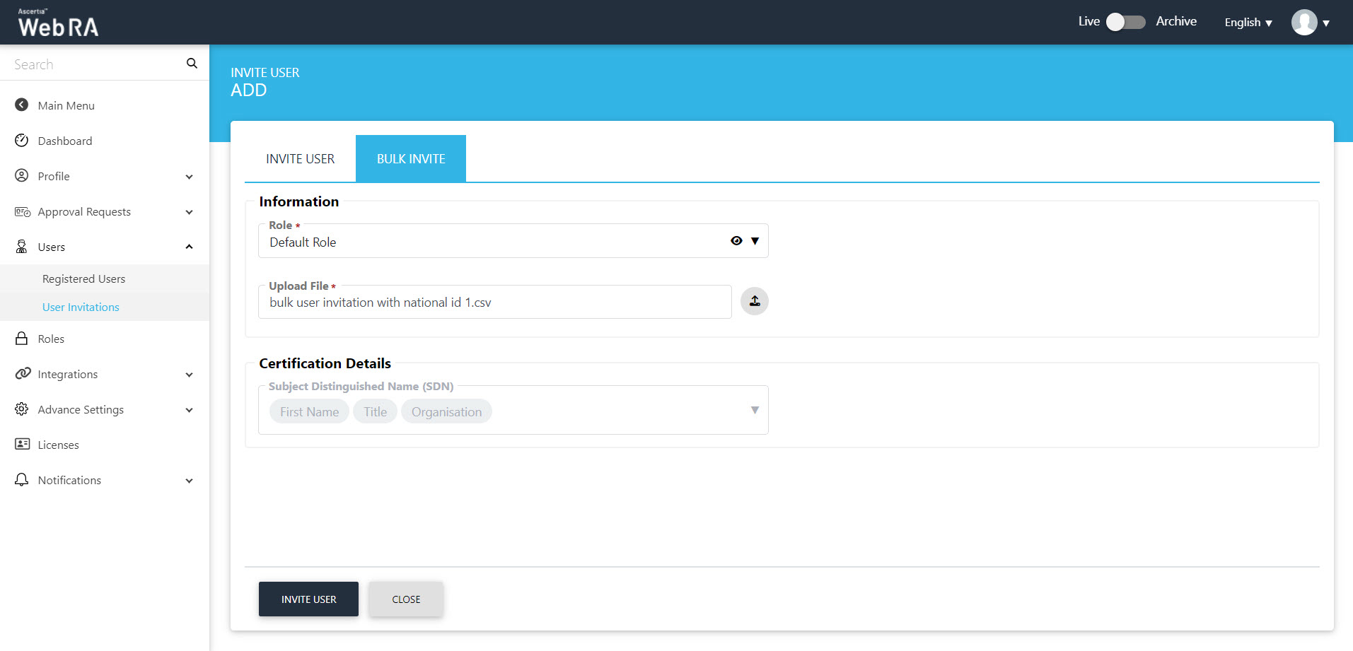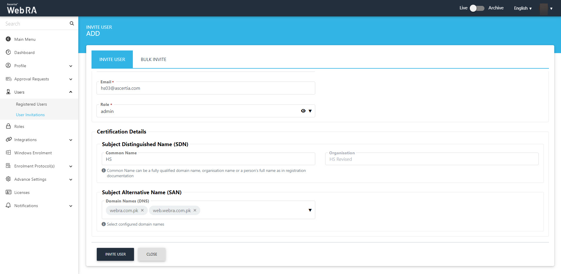 This section contains the list of RDN’s control by the administrator in the role while inviting the user. "Certificate Details" section will show the SDNs if enabled in the enterprise role settings.