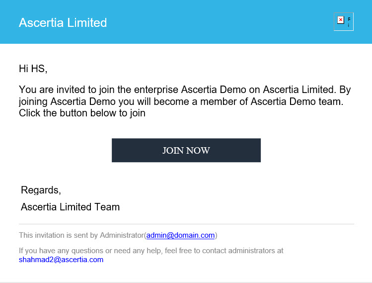 An invitation will be sent to the user via email. Click Join Now to proceed with the sign up process.