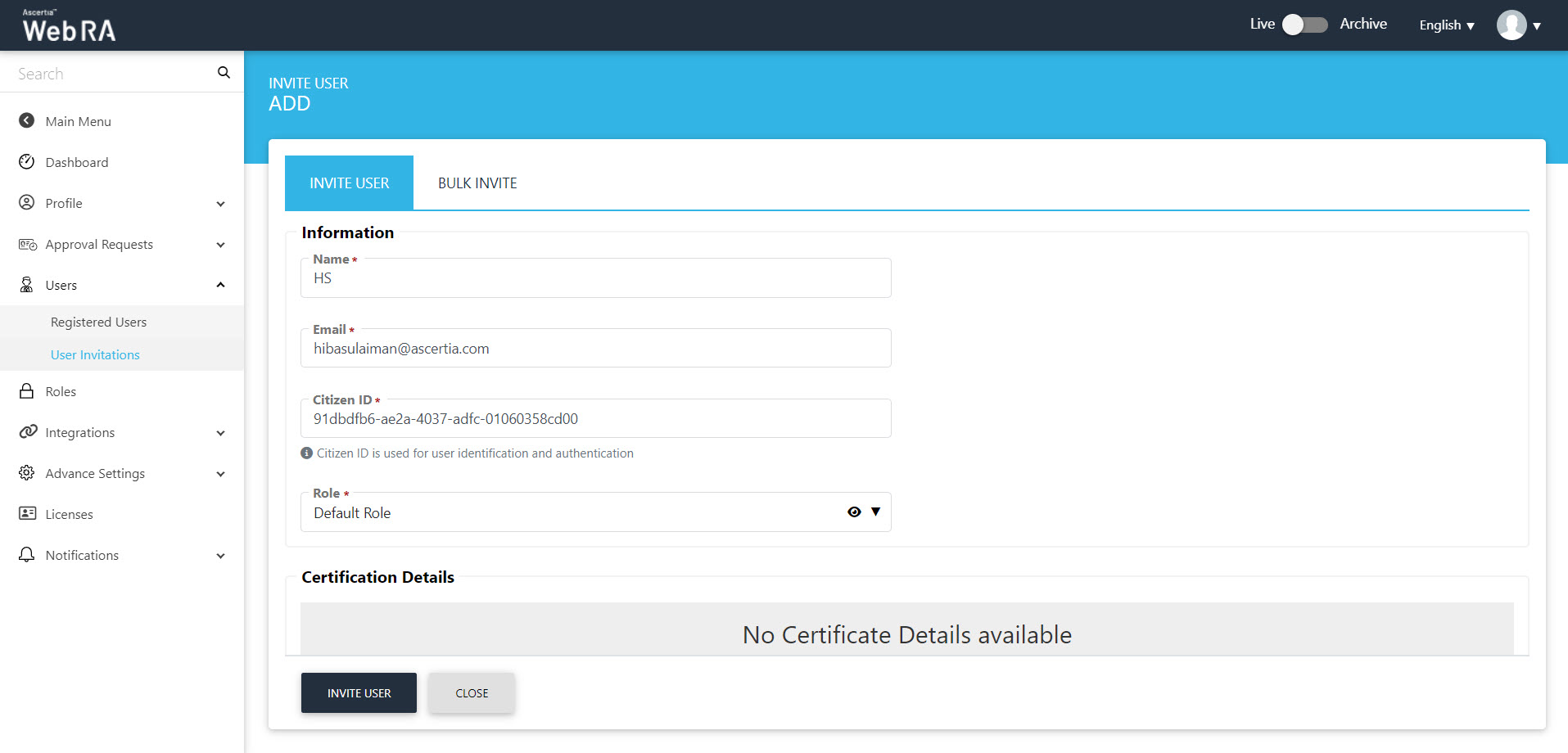 Provide the user information that include name, email, citizen ID, select a role and click Invite User. It is mandatory to fill fields marked with red asterisk.