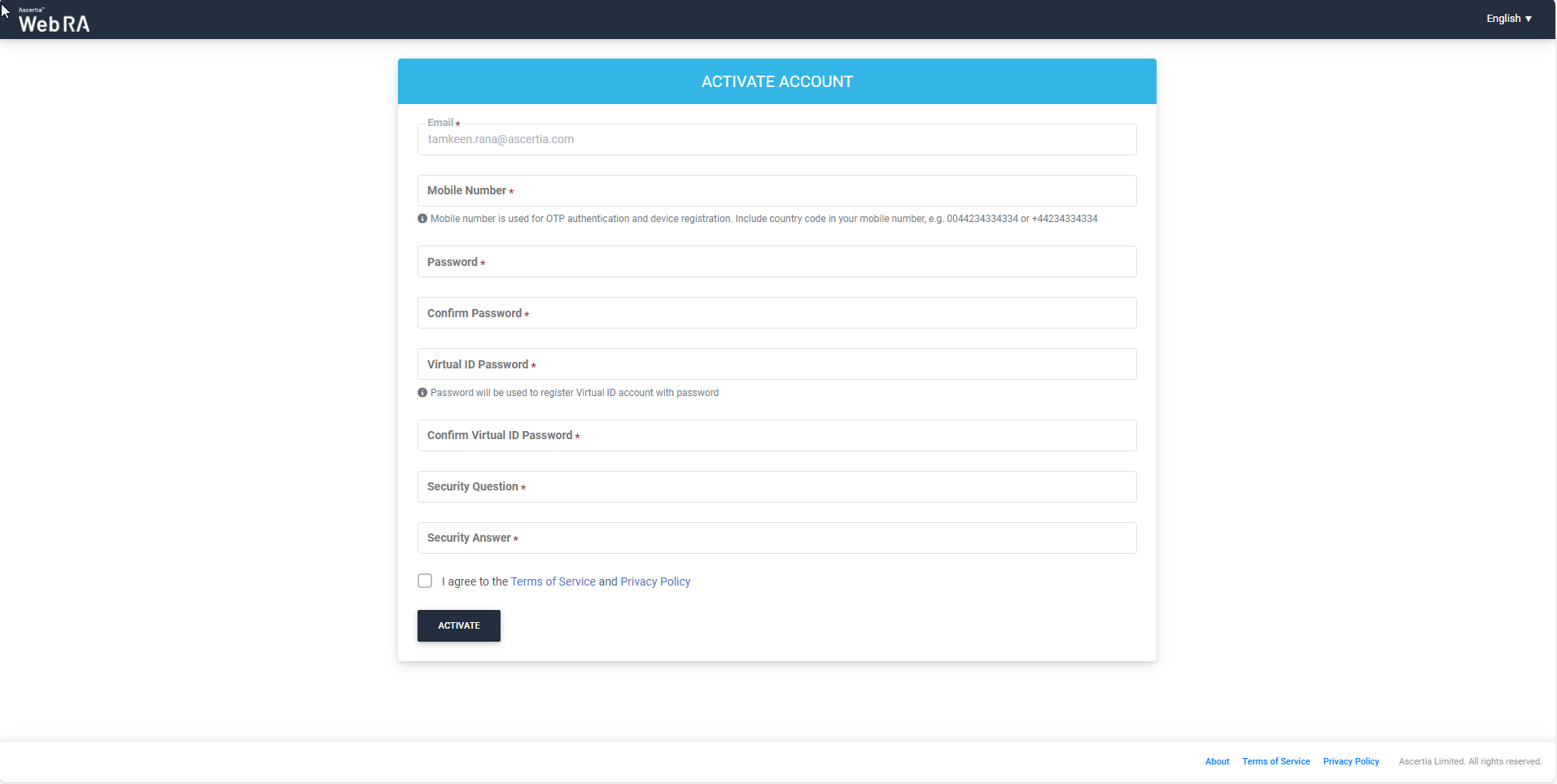 If the ‘Enable Virtual ID Registration with Password’ option is enabled in the RAS certification profile, then the system will display the following two fields on the screen while activating an account: