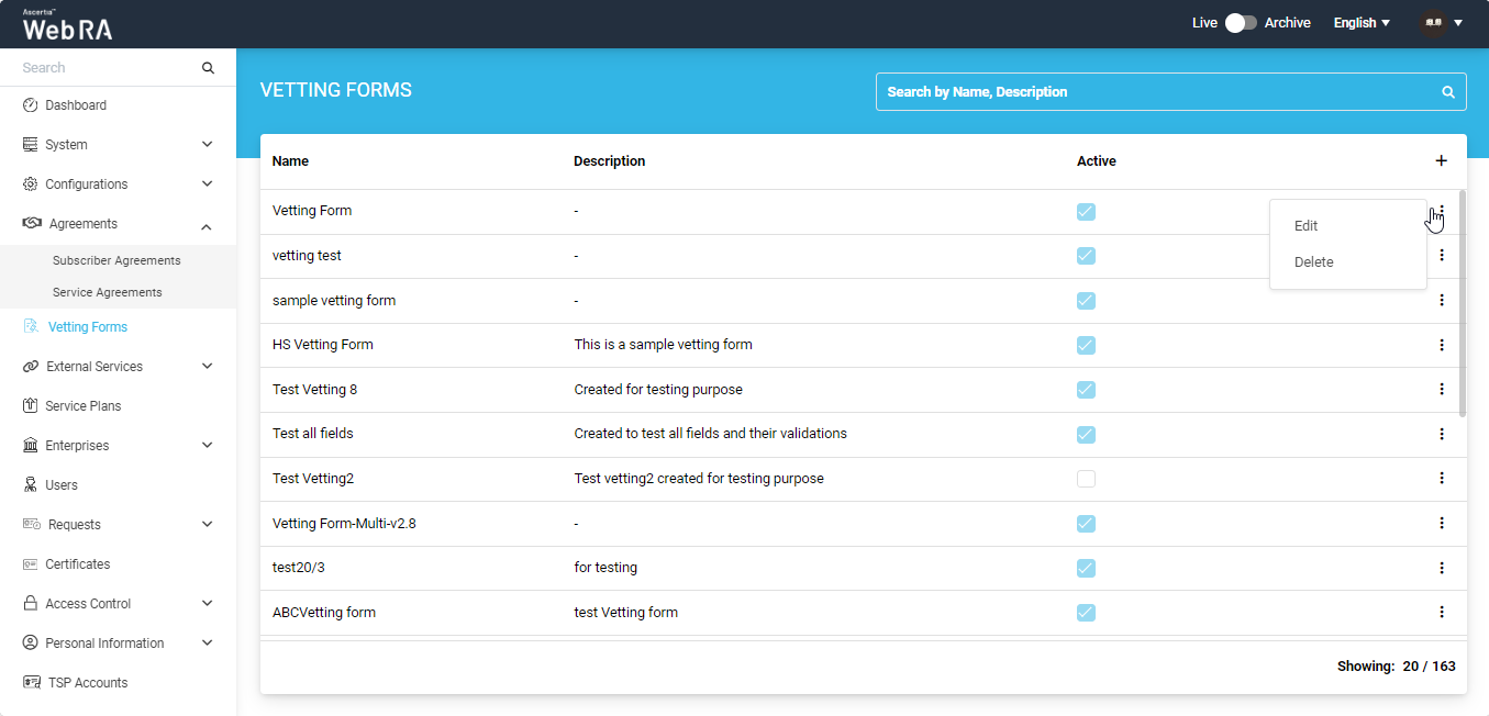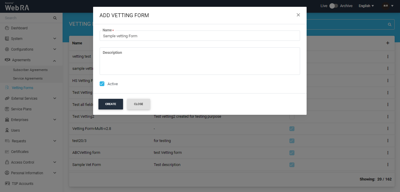 A vetting form is associated with each service profile (i.e., Certification and CSP) to facilitate the vetting process required for the issuance of respective certificates. The process of configuring a vetting form is identical for both service profiles. You can configure a single vetting form for both service profiles or create separate vetting forms for each.