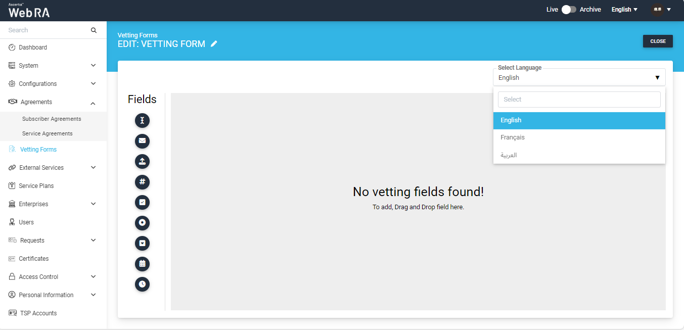 While creating a vetting form, the Select Language drop down will contain only allowed language that is configured in the default settings of the application. |