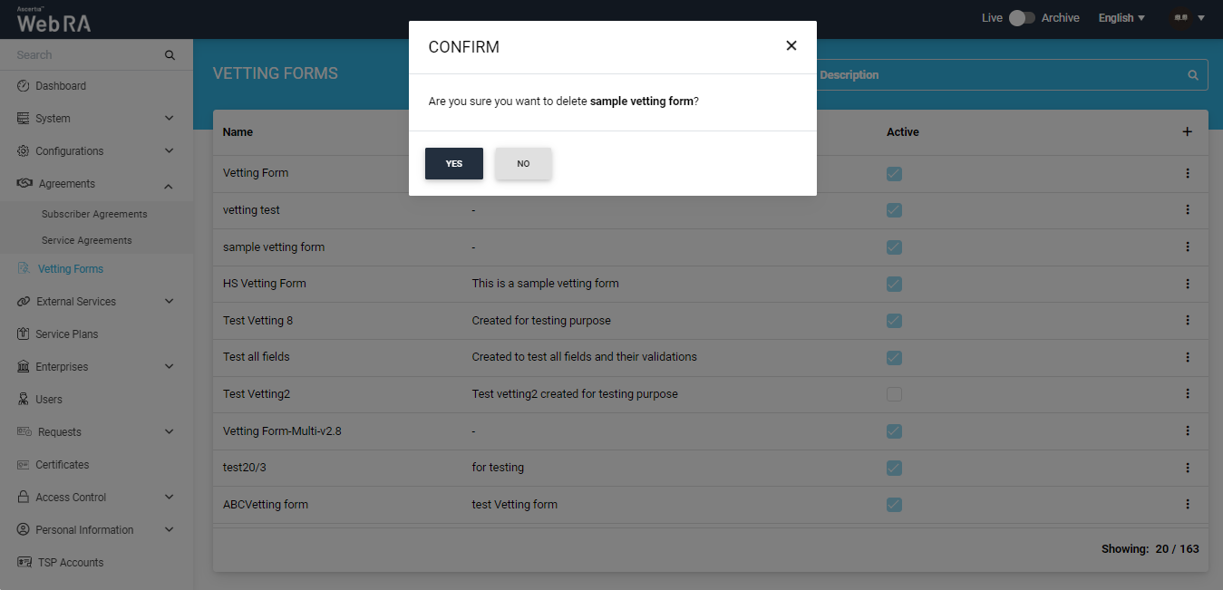 An operator can choose whether a certificate will be vetted by the Administrator RAO or the Enterprise RAO from the Certification Profiles. |