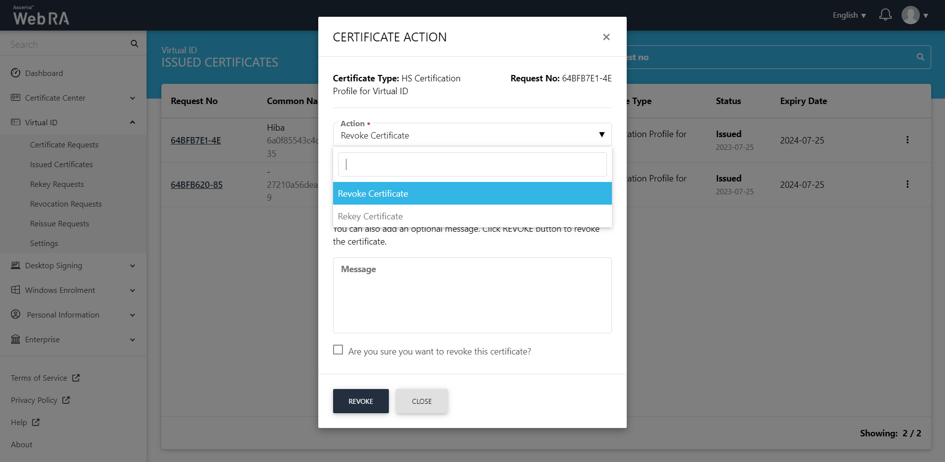 Click Rekey, a certificate rekey confirmation will appear. You can enter an optional message, then click Rekey.
