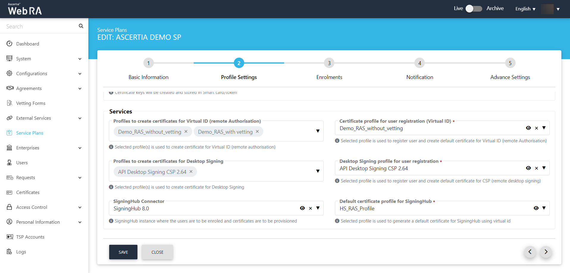 - The ADSS Web RA Certification Profile must be configured in the Service Plan