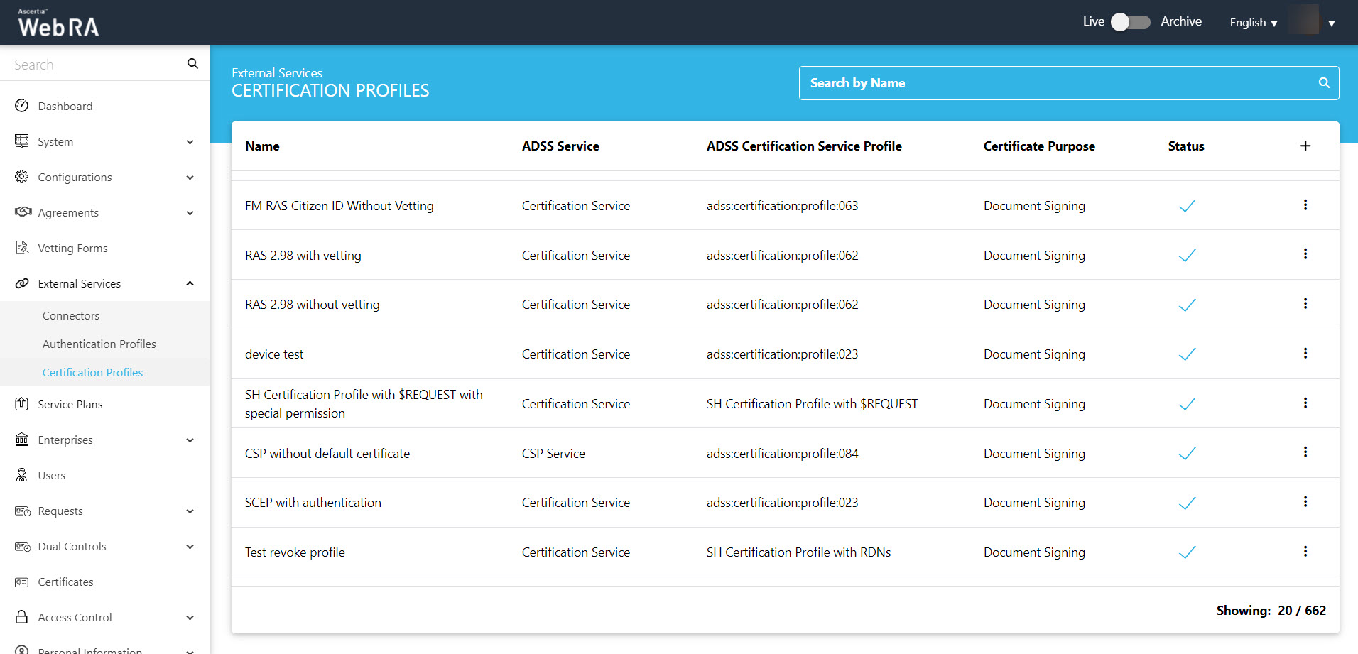 - From the admin portal, expand External Services > Certification Profiles from the left menu to see the certification profiles listing screen.