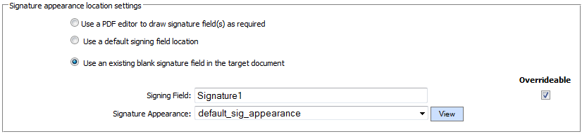 | Use an existing blank signature field | If selected then following options are shown: 1. Signing Field If the document already has a blank signature field, then the name of the signature field can be specified using this option. When ADSS Server signs a PDF document using this signing profile it will then search for this signing field and embed the signature details within that field. This is also a good way of positioning the signature in an exact location rather than just the default locations mentioned above.  Note: Signature field names are case-sensitive so ensure you enter a valid field name as used in your documents, e.g. field1 and Field1 are not the same.  2. Signature Appearance Select one of the PDF Signature Appearances already generated as mentioned in the section PDF Visible Signatures. Overrideable flag indicate whether the details configured in the signing profile can be amended by the client application by passing parameters in the signing service request message. Select the check boxes for those values that the client application is able to override in this signing profile.  This provides a great deal of flexibility to the client application to override the signing profile settings at the time of sending the request to ADSS Server. |