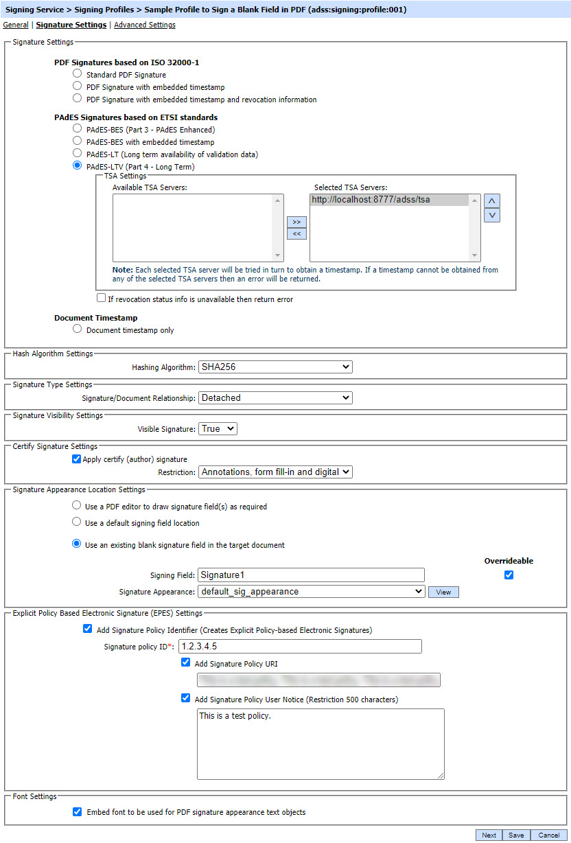 | EPES signature | Explicit Policy Based Electronic (EPES) signature settings are only available for the PAdES signature types. By enabling the check box Add Signature Policy Identifier, the signing profile can be used to produce (EPES) signatures where a signature policy OID, URI and user notice are added in the digital signature as specified below. 1. Signature Policy Object ID A Mandatory field Provide the Signature Policy OID to be added for EPES signatures. 2. Signature Policy URI An Optional field. Provide the Signature Policy URI to be added for EPES signatures. If there is no Policy URI defined inside the signing profile then EPES configurations should be made in policy.properties file located at: [ADSS Installation Directory]/service/ Open this file in any text editor and enter policy OID and path to the policy document  e.g. 1.2.3.4.5 = "F:/Policy_File" The ADSS Signing Service can retrieve the signature policy document in either one of the following ways: Using Policy URI defined in signing profile. The ADSS Signing Service will use this policy URI to retrieve the online available policy document and its hash value will be calculated and embedded in the signed properties of the signature. Using locally configured signature policy document. The ADSS Signing Service will use this text file pointer to retrieve the locally-saved policy document, hash and embed it in the signed properties of the signature.  3. Signature Policy User Notice Provide the user notice to be added to the EPES signatures. |